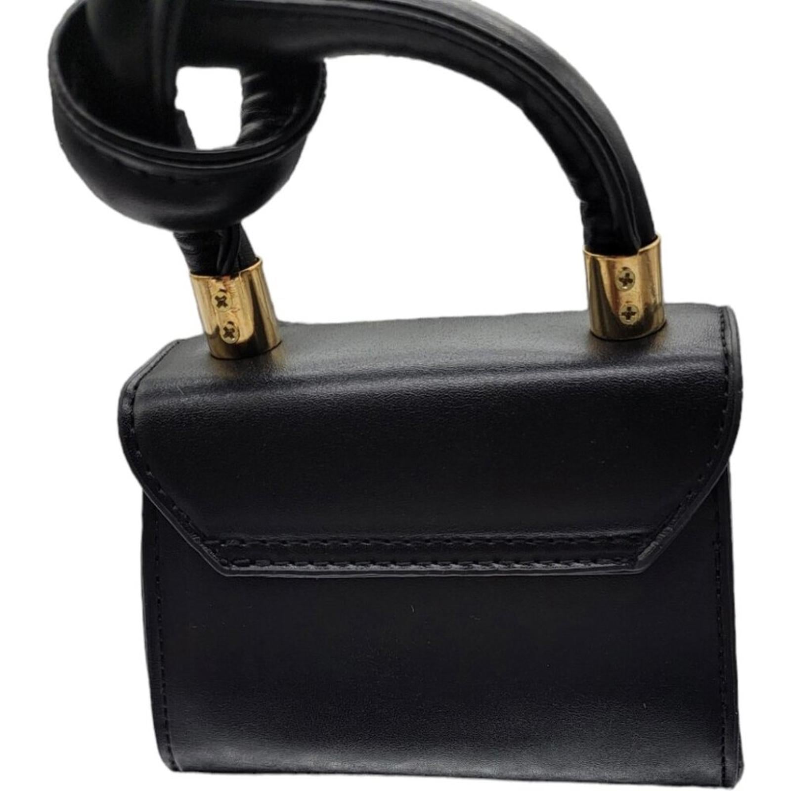 This stylish black mini handbag features a unique knotted handle design accented with gold-tone hardware. It includes a detachable gold chain strap for versatile carrying options. The bag has a sleek, smooth finish with a flap closure, perfect for carrying essentials in a compact size.