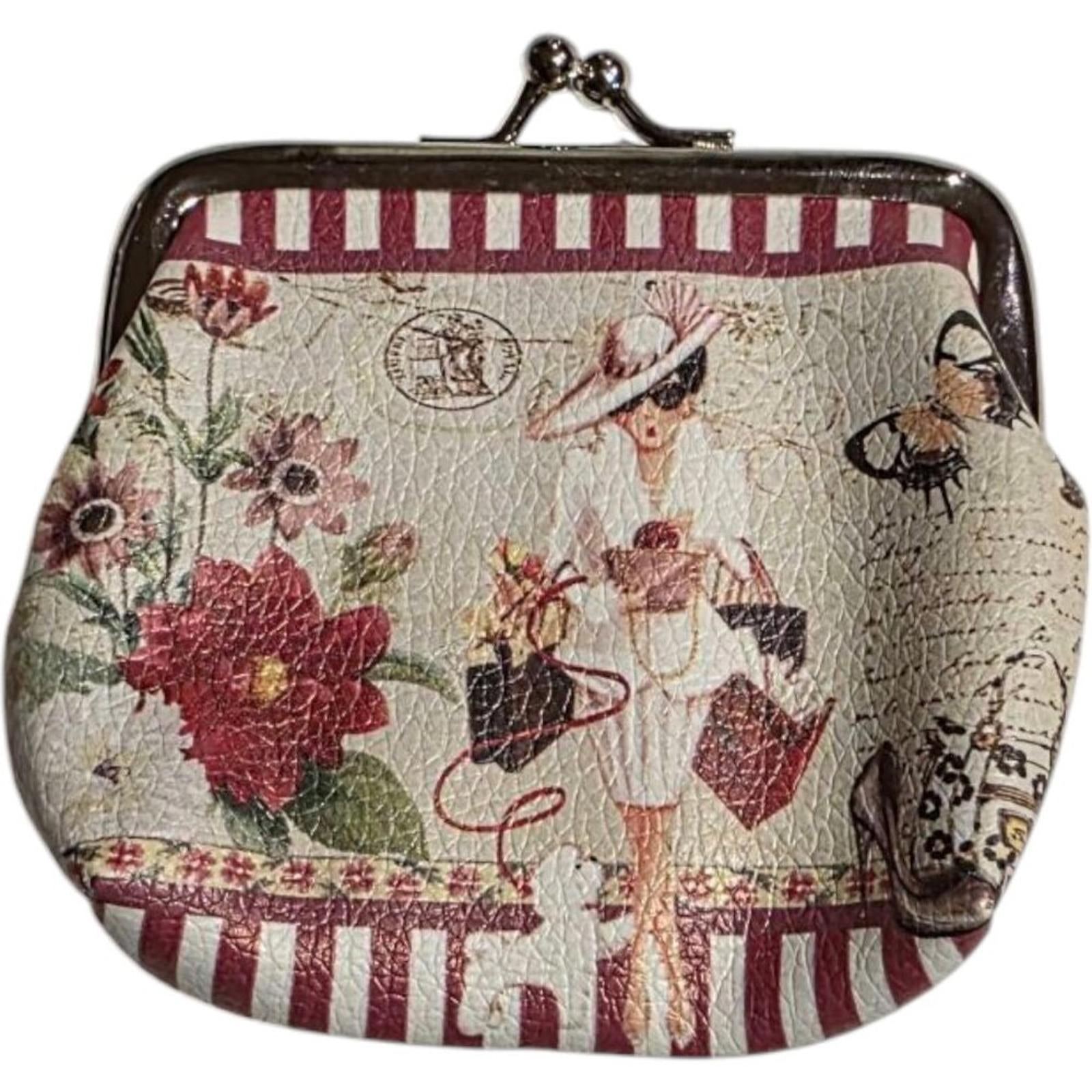This vintage style coin purse features a charming fashion illustration of a woman with shopping bags, flowers, and butterflies. The purse has a metal clasp closure and a soft beige interior lining. Compact and stylish, perfect for carrying coins and small essentials.
